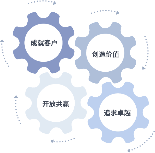 成就客户是一切决策的出发点,,,创造价值是衡量所有工作的标准,,,,追求卓越是我们做事做人的态度,,开放共赢是我们的格局也是最终的结果。。。。价值观的齿轮环环相扣,,推动着组织里的每个人不断向前。。。。