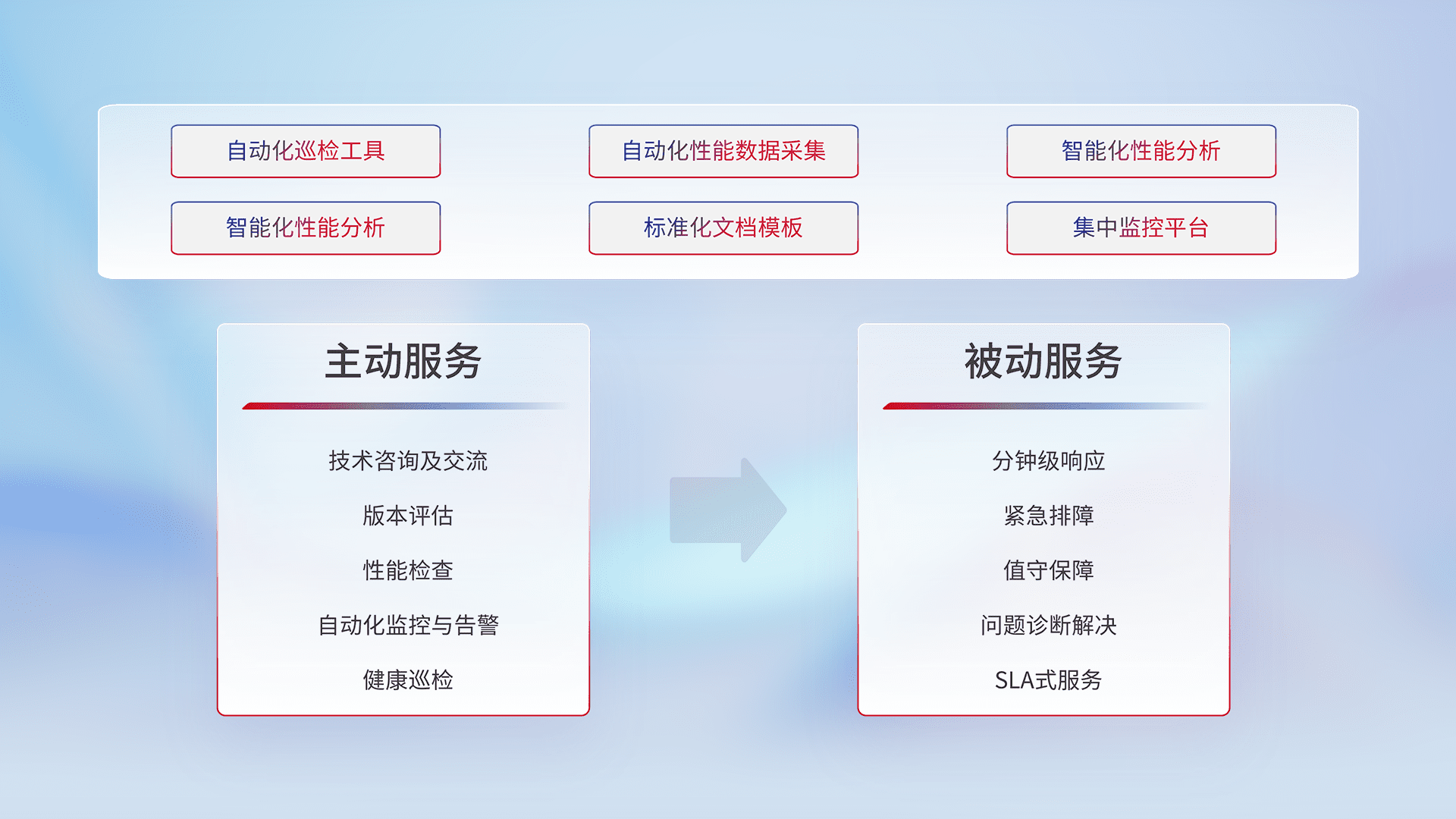智能化工具和标准化文档,,保障服务质量,,,,提供主动服务(包含技术咨询、、、版本评估、、、性能检查、、自动化监控与告警、、健康巡检)和被动服务包含(分钟级响应、、紧急排障、、、值守保障、、、、问题诊断解决、、、SLA服务)。。