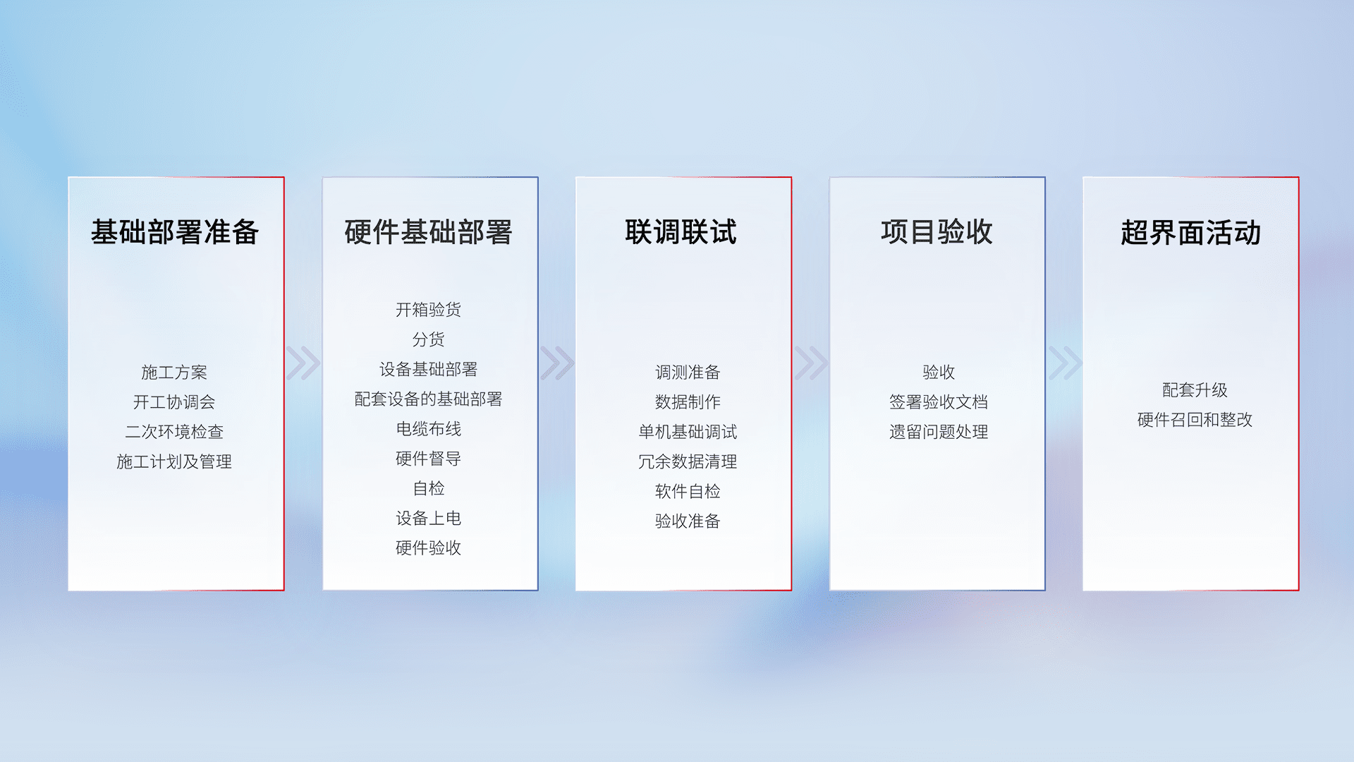 从基础部署准备、、硬件基础部署、、联调联试、、、、项目验收、、、越界面活动的全过程可追溯,,,保证施工质量和进度。。
